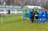 O godzinie 10 30 na Stadionie Miejskim w Barwicach swój mecz rozpoczęli podopieczni Łukasza Zbroszczyka. Juniorz młodsi na własnym boisku podejmowali lidera - AP Szczecinek. Mecz od początku był w miarę wyrównany, choć składniejsze akcje przeprowadzali goście, to jednak nasi zawodnicy jako pierwsi zdobyli bramkę. Niestety sędzia dopatrzył się spalonego. Ale co się odwlecze ... Chwilę później zawodnicy Błoni po strzale kapitana Darka Bernaciaka wychodzą na prowadzenie. Takim wynikiem kończy się pierwsza połowa. Niestety w drugiej połowie nasz zawodnik Michał Adamski został brutalnie sfaulowany i ze złamaną nogą odwieziony na Izbę Przyjęć do Szczecinka. Na boisku jedna z akcji gości - Julek chcąc wypiąstkować piłkę mija się z nią i ta wpadła na nogi Jakuba Gołuckiego, który niefortunnie skierował ją do swojeje bramki. Zawodnicy podbudowani takim obrotem sprawy zwietrzyli szansę na trzy punkty i wykorzystali to bezlitosnie w krótkim czasie strzelając 4 bramki. Mecz zakończył się wynikiem 5:1 dla AP Szczecinek.